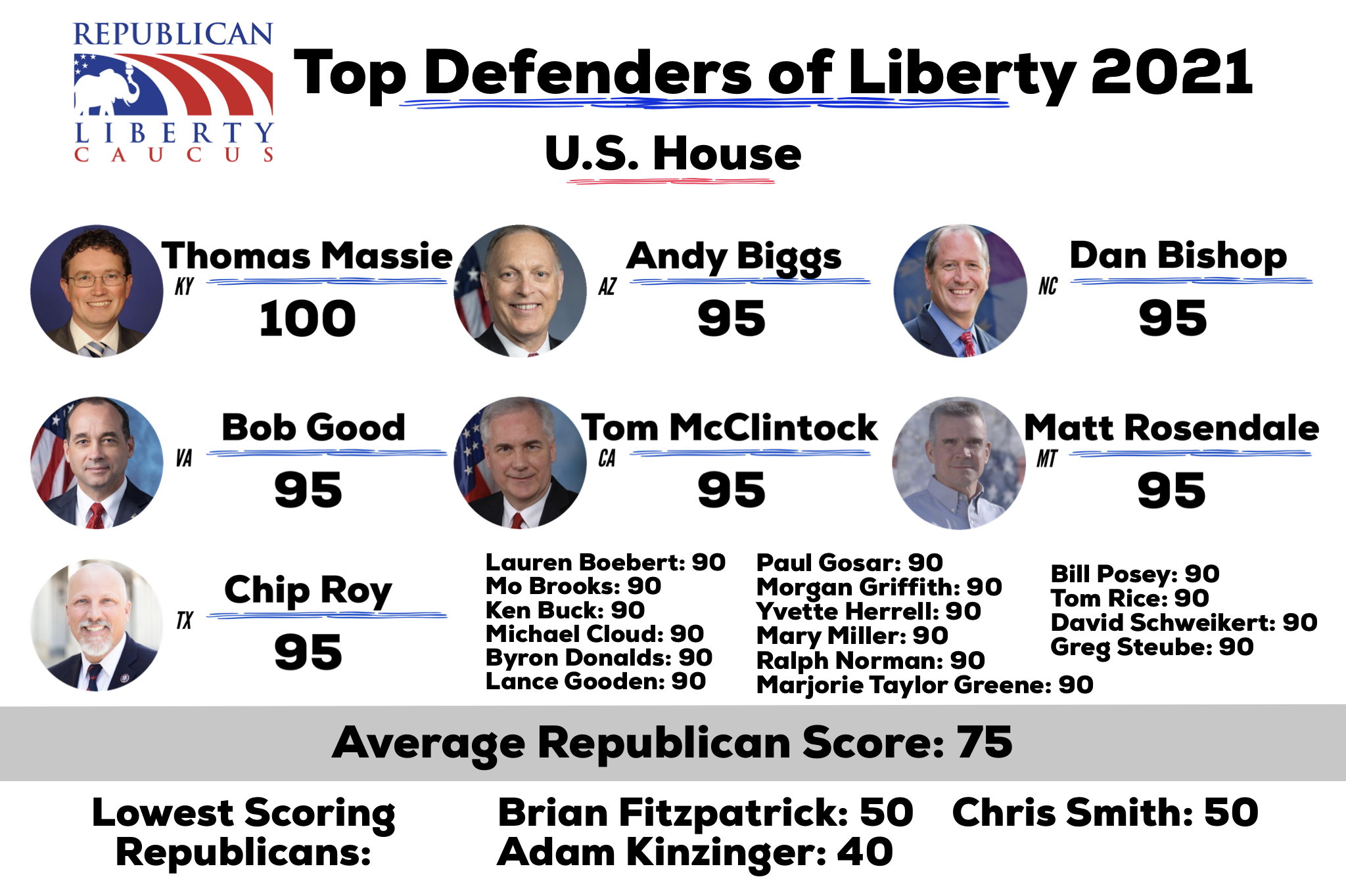 A high score on this scorecard does not equate to an automatic endorsement from the RLC. This scorecard simply evaluates the voting record of each Republican member of Congress during the 2021 calendar year.